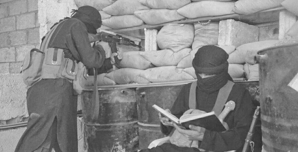 This text is deeply imbued with religious emotion and hostility toward everyone who is outside “the community of believers.” The message conveyed by the text, whose concluding prayer is derived from al-Fatihah, the very first chapter of the Koran, known to all Muslims, is reinforced by visual elements: one fighter stands guard while another presumably reads the Koran, with the Islamic State flag dominating the landscape. Again, we see violence and religion closely interwoven, for the combination of the “warrior-Islamic scholar” has become an integral part of IS iconography.