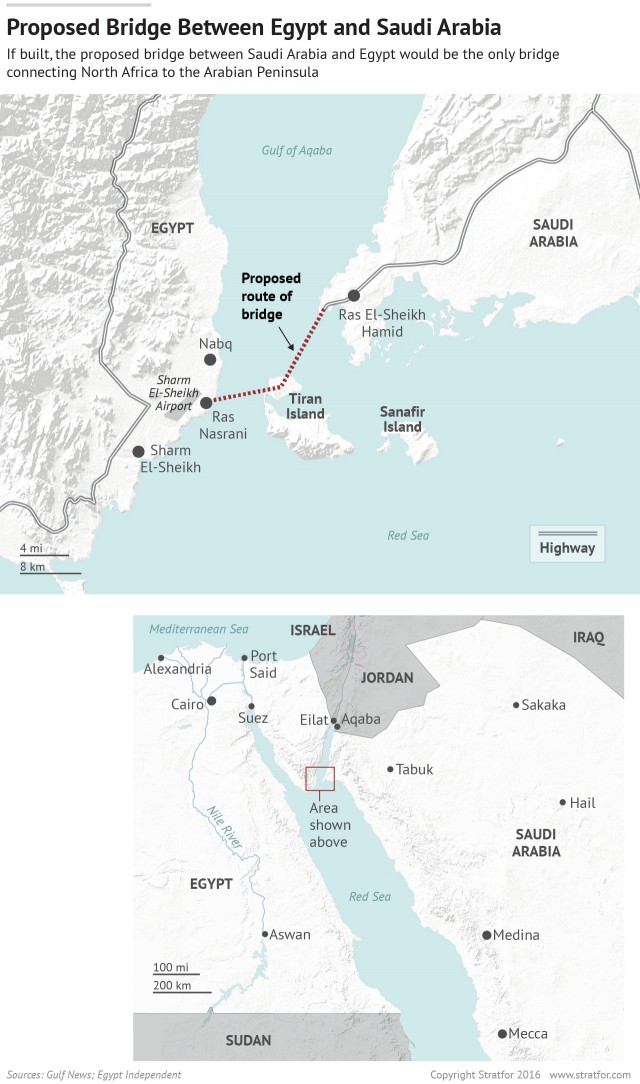 During Saudi King Salman's first official visit to Cairo recently, he and Egyptian President Abdel Fattah al-Sisi announced their intent to revive the often-discussed plans to build a bridge that would create a direct link between their countries. While the bridge plans are somewhat nebulous, the two leaders also signed off on a more concrete accord, an agreement that redraws the maritime boundary between the two nations to return control over two strategic islands situated at the entrance to the Gulf of Aqaba, Tiran and Sanafir, to Saudi Arabia. If the bridge is ever built, it could prove a mixed blessing for both states; the island transfer, on the other hand, has created political outrage in Egypt.